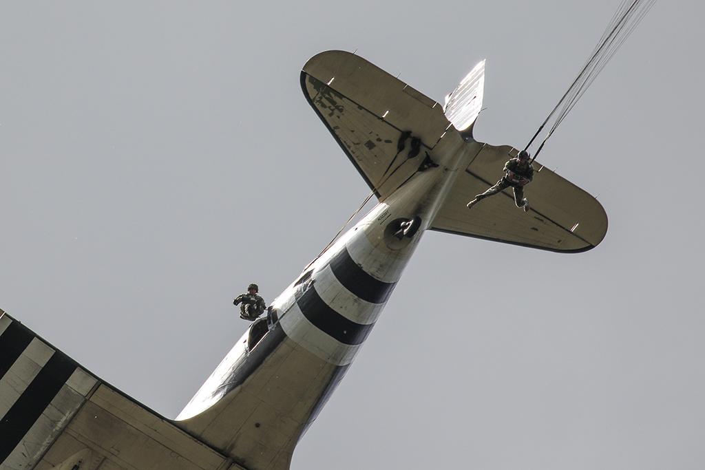 Two static jump parachutists and World War II reenactors jump from a C-47 Dakota nicknamed "TiCo Belle" during the 2015 TiCo Warbird Airshow in Titusville, Florida.