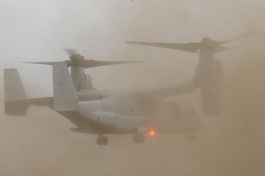 A U.S. Marine Corps MV-22 Osprey kicks up a ton of dust while coming in to land during a Marine Air Ground Task Force (MAGTF) demonstration at Rye Playland, New York during Fleet Week New York activities.