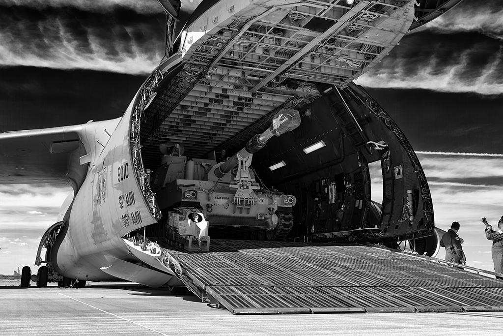 A C-5M Super Galaxy prepares to unload an M109A6 Paladin howitzer.