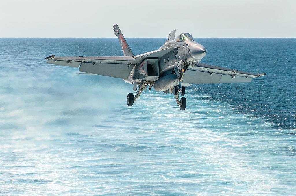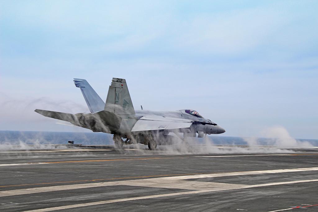 Salty Dog 100 on approach during Magic Carpet testing aboard USS George H.W. Bush.