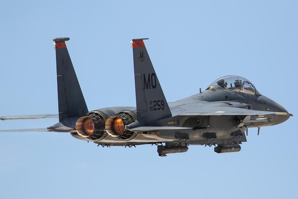 An F-15E Strike Eagle from Mountain Home AFB blasts into the skies above Nellis AFB at the start of yet another Red Flag 15-3 sortie.
