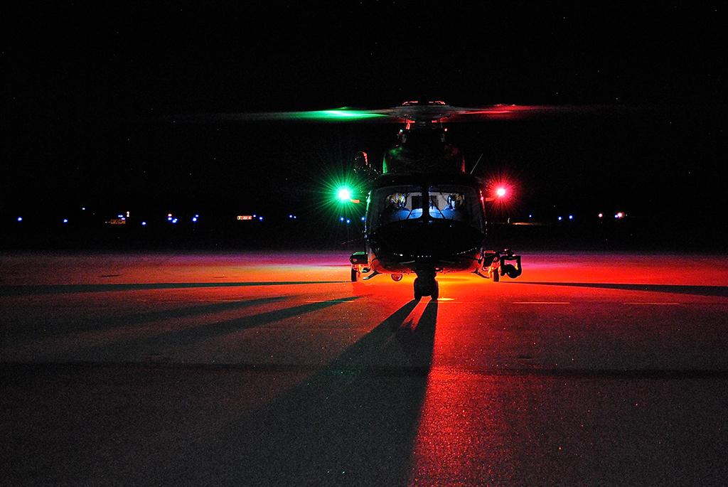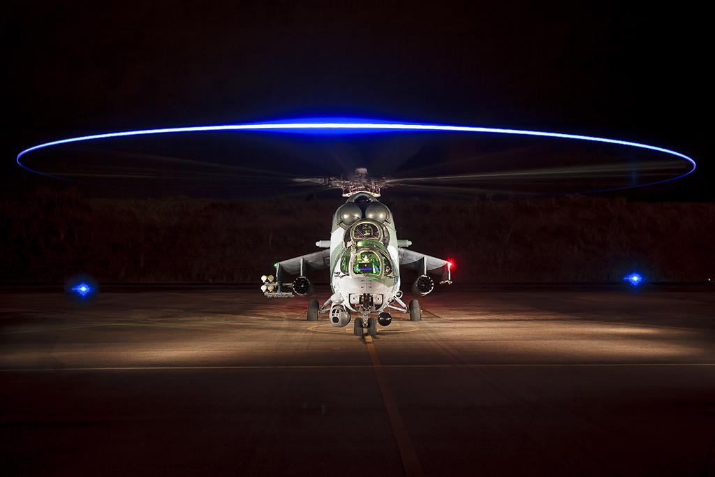 AH-2 Sabre Helicopter (Mil Mi-35) in night takeoff procedure at Porto Velho air base, Brazil.