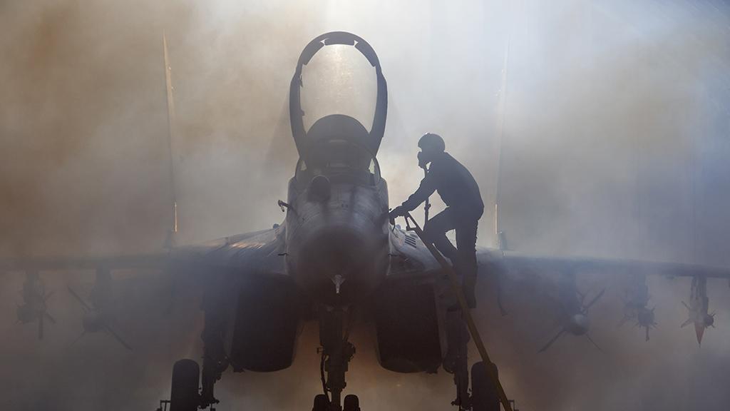 Bulgarian air force pilot preparing for a training mission with fully armed MiG-29. Graf Ignatievo Air Base, Bulgaria.