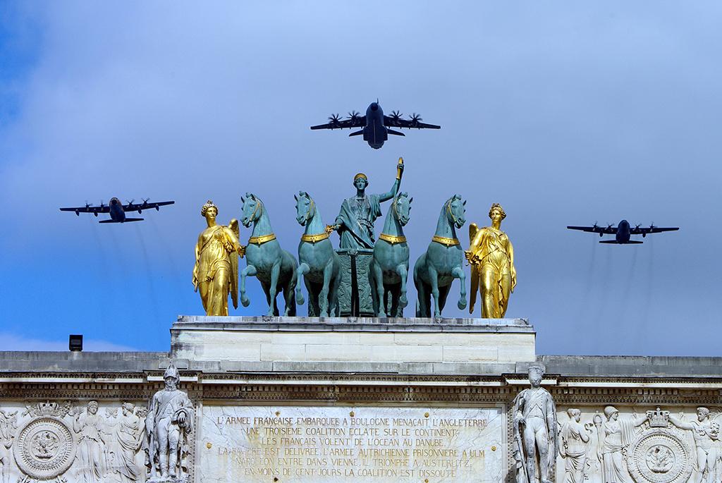A French air force A400M transport leads two C-130 Hercules over a Paris landmark, the Arc de Triomphe du Carrousel.