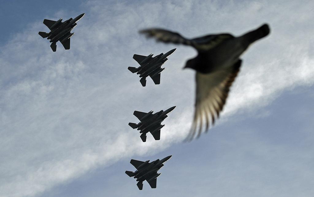 A bird soars as four of five F15 fighter aircraft from the Massachusetts National Guard fly over Boston during a scheduled training mission, Nov. 13, 2014.