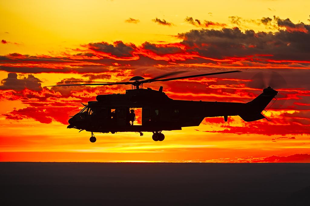 EC-725 Caracal helicopter of the Brazilian air force flying in for Amazon sunsets. In flight over Amazon jungle in Brazil.
