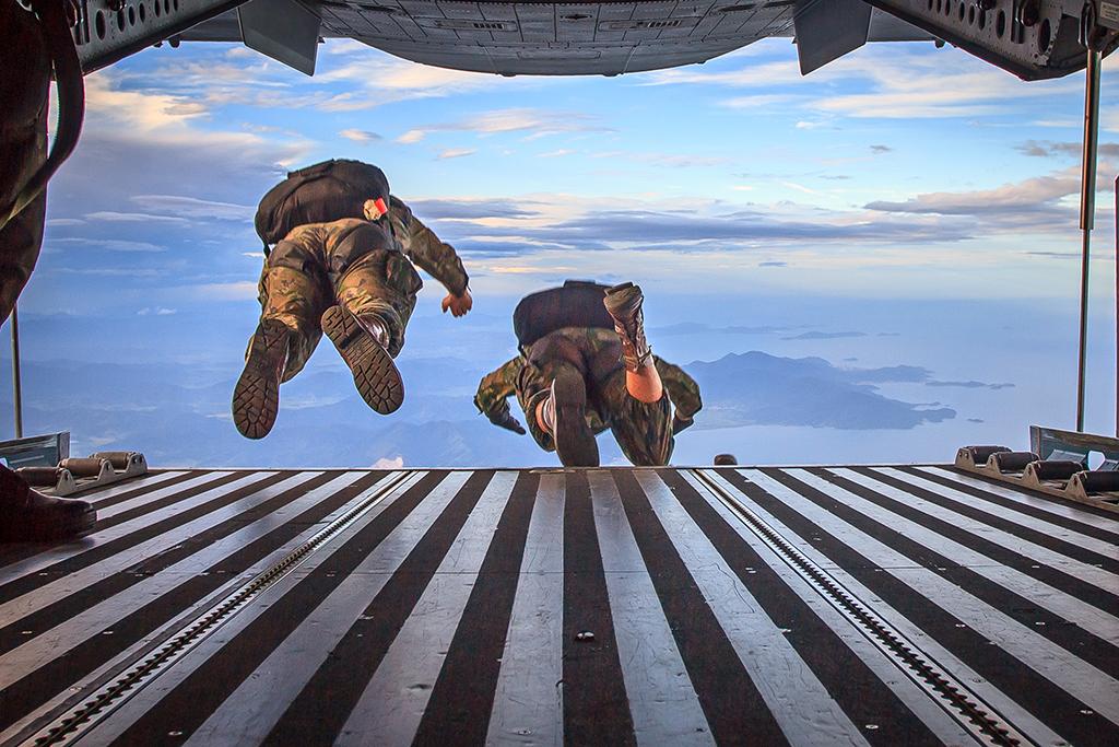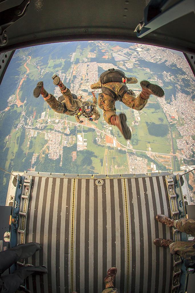 Two rescuers jumping from an SC-105 Amazona (CASA-295) over the Santa Catarina shore in Brazil.