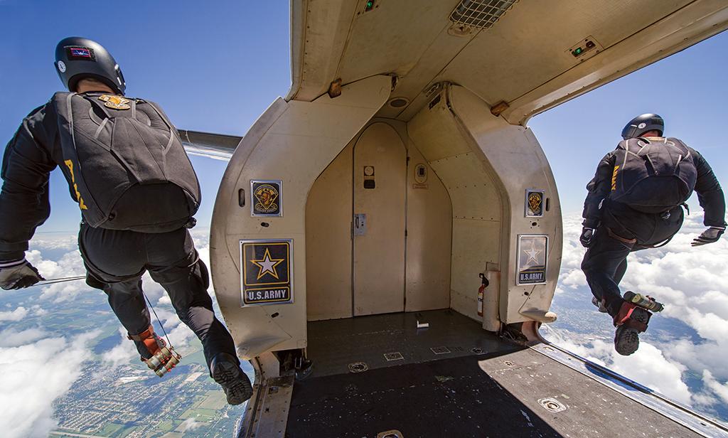 Two members of the U.S. Army “Golden Knights” Parachute Team exit their Fokker C-31A aircraft at 12,500 ft. over Dayton, Ohio, during the Vectren Dayton Air Show.