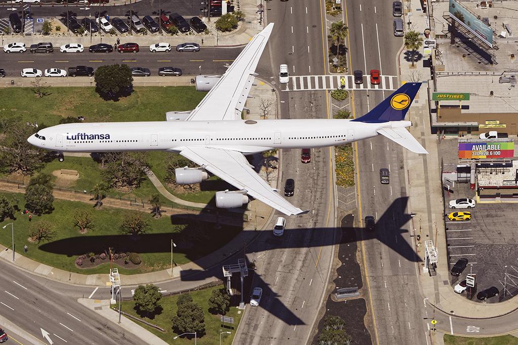 A Lufthansa Airbus A340-600 casts its shadow on a road while approaching Los Angeles International Airport.