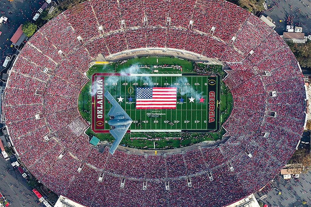 A Northrop Grumman B-2 stealth bomber flies over the stadium as the national anthem concludes at the 104th Rose Bowl game on Jan. 1 in Pasadena, California.