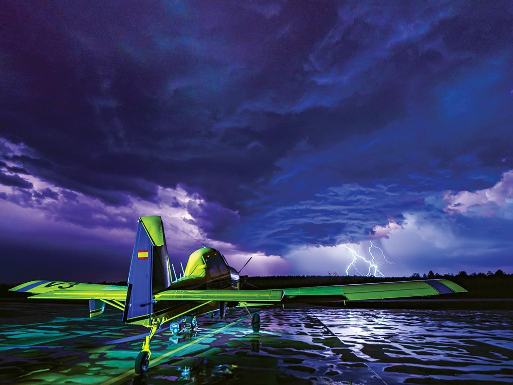 An Air Tractor AT-802 firefighting aircraft waits for the call to action as lightning strikes on the horizon in the Spanish province of Cuenca.