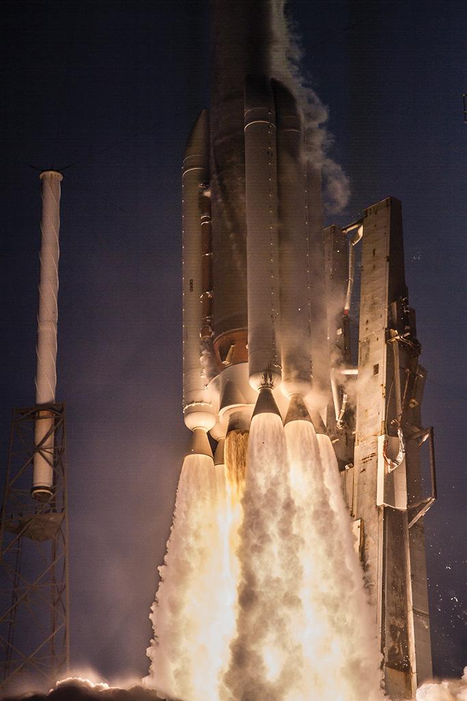 A two-nozzle RD-180 engine and five Aerojet solid rocket boosters propel the most powerful version of United Launch Alliance Atlas 5's rocket into space with AFSPC-11 for the US Air Force.