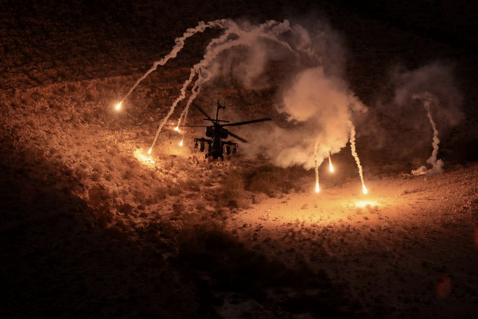 Apaches from the "Magic Touch " squadron release flares simultaneously in the southern part of Israel, creating this amazing view.
