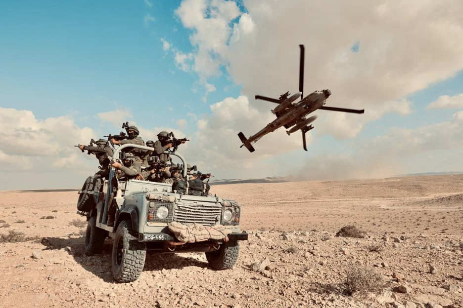 An Israeli Defense Force AH-64 Apache helicopter flies above special forces on the ground.
