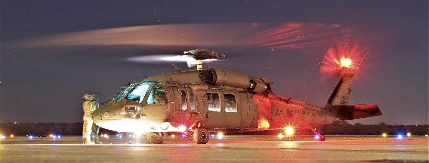 A Mississippi National Guard UH-60 stationed in Jackson, Miss., is about to depart Key Field, Meridian, Miss., for some nighttime work after a splash of gas and a bite to eat.