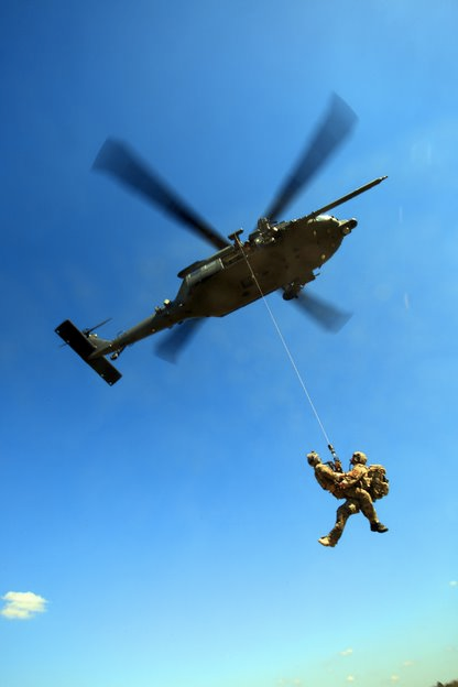 A U.S. Air Force HH-60W Jolly Green II conducts a personnel recovery exercise with combat para-rescue forces from the 38th Rescue Sqdn. based at Moody AFB Georgia.