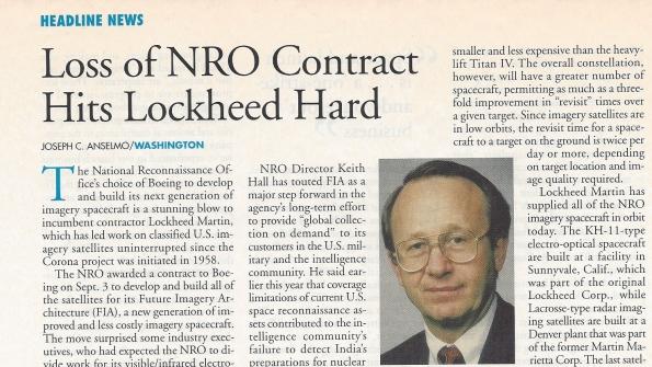 The Future Imagery Architecture award for visible/infrared electro-optical satellites and radar imaging spacecraft was a huge blow to Lockheed, which had led work on classified U.S. imagery satellites uninterrupted for more than 40 years. I was Aviation Week’s space technology editor at the time, and noted in an article that Boeing’s proposal offered substantial savings, using upgraded technologies to offer twice the performance at half the cost.