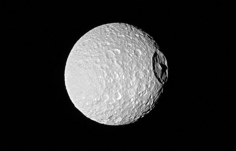 Astronomers believe the huge Herschel crater, with a central peak almost as tall as Mount Everest, was created in a primordial collision with Mimas that was not quite violent enough to shatter the moon into fragments. Saturn’s rings probably were formed from those fragments, reaching equilibrium over the eons, so that their constituent particles nudge each other gently while whirling around the planet at speeds as high as 40,000 mph.