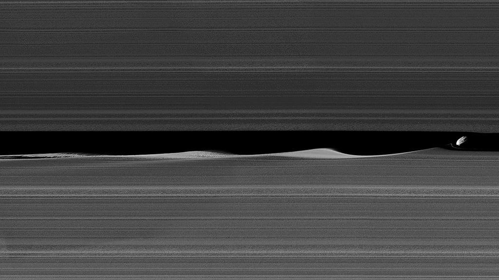 Daphnis, a moon embedded in Saturn’s rings, has just enough of an inclination that it pulls the ring material into waves that would appear as sheer mountains to an astronaut cruising alongside them. The moon is only 5 mi. across.