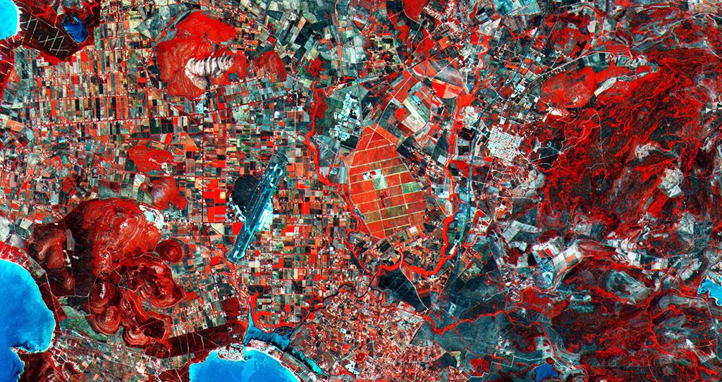 The Sentinel-2 mission carries a wide-swath high-resolution imager with 13 spectral bands that can acquire optical data from the visible and near-infrared (IR) to the shortwave IR at different spatial resolutions, taking land monitoring to an unprecedented level. Sentinel-2 is the first optical Earth-observation mission of its kind to include three bands in the “red edge” to provide key information on the state of vegetation. The area pictured covers a section of the Italian island of Sardinia’s northwestern Sassari province, with parts of the coast visible along the left side and bottom. Agricultural fields dominate the inland, with a large area of vineyards at the center of the image.