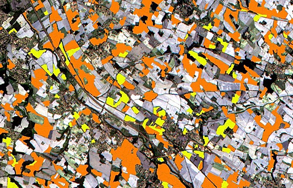 Sentinel-2A, which can image the globe precisely down to the size of a single tree, can map the Earth regularly and deliver images over long periods of time. The satellite can see where a forest is cut and how this affects habitats, and it can distinguish between a healthy tree and a dead one due to its IR footprint. It can also sense the difference between a lush meadow and a dry one, or between rich and poor crop yield. In this image, the instrument was able to discriminate between two types of crops: sunflower (in orange) and maize (in yellow).