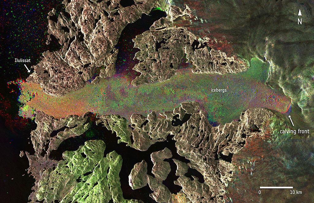 Sentinel-2A is the second satellite launched under Europe’s Copernicus program, following the Sentinel-1A radar satellite built by Thales Alenia Space and launched in 2014. In this radar image captured by Sentinel-1A, the Jakobshavn glacier in western Greenland is seen before and after a massive calving event Aug. 14-16, 2015.