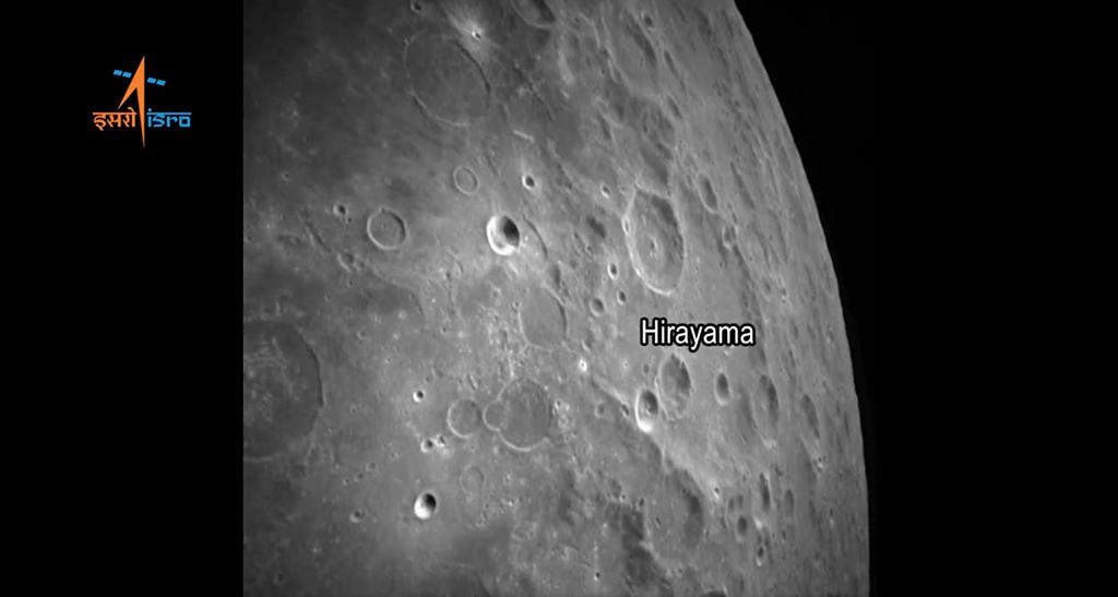 The craters Giordano Bruno and Harkhebi J are seen here in this image taken Aug. 17 by Chandrayaan-3's Lander Imager Camera 1. Further in the background, the Earth is barely seen peeking from behind the Moon.