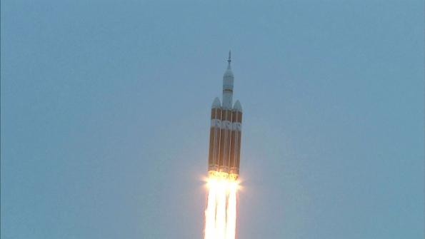 The second stage of the United Launch Alliance Delta IV rocket that lifted Orion to orbit from Cape Canaveral Air Force Station, Fla., at 7:05 a.m. EST, roared to life again at 9 a.m., for 4 minutes, 40 seconds to achieve the desired 3,604 mile high peak altitude for the mission at 10:11 a.m.