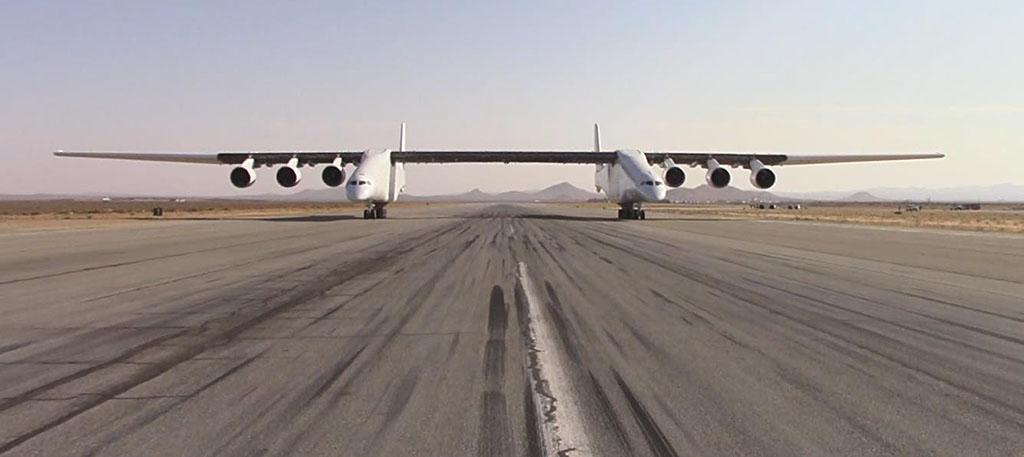 Stratolaunch Systems conducted the first taxi tests of its six-engine, air-launch carrier aircraft on Dec. 17 in Mojave, California. Powered by six Pratt & Whitney PW4056 engines, the twin-fuselage, 385-ft. span aircraft is designed to air-launch small to medium-size satellites into low Earth orbit and is expected to make its first flight in early 2018.