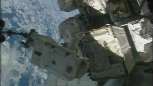 During Tuesday's spacewalk, Gerst secured himself to the tip of the station's 58-foot-long robot arm to swing out from and under the central ISS solar power truss with the 780 pound pump module. The robot arm, controlled from inside the station by NASA astronaut Barry Wilmore, moved him to a new storage platform near the U.S. airlock, which could become the staging site for a future pump module repair.