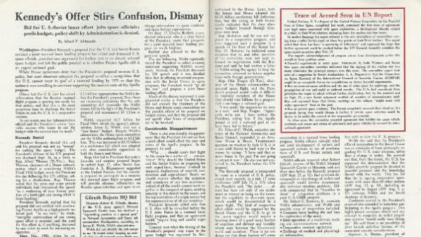 Aviation Week’s conservative editor-in-chief, Robert Hotz, weighed in with a signed editorial titled “Kennedy’s Space Boomerang.” Calling the UN speech an “extraordinary feat of political contortion,” Hotz warned that it “ represented a basic shift in U.S. space policy that is losing political support for the program and braking much of the technical momentum already achieved... The Soviet contributions to international space technology gatherings in recent years have been vapid and inconsequential compared with the data they have obviously garnered.”