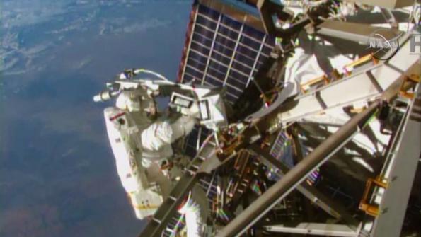 As soon as they departed the ISS airlock, Virts and Wilmore parted company, quickly moving to the mid-points of the port and starboard segments of the station's 360-foot-long solar power truss to install booms and equip each with two antennas.
