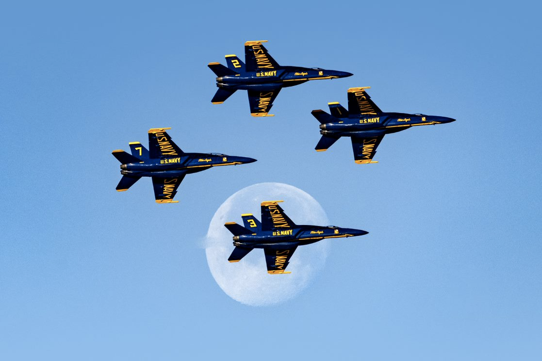 The U.S. Navy Blue Angels streak across the sky as the moon looms in the background at Naval Air Facility El Centro, California.