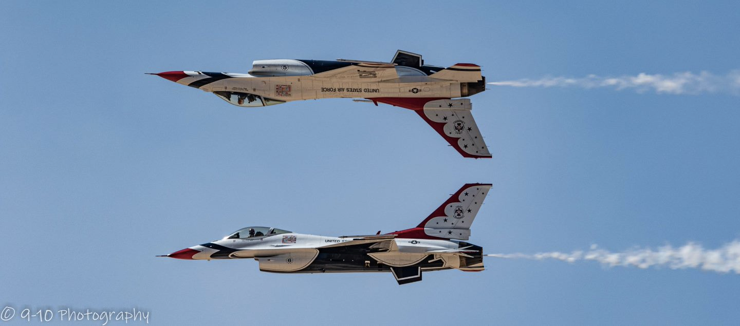 The U.S. Air Force Thunderbirds fly F-16s in a mirrored pass.