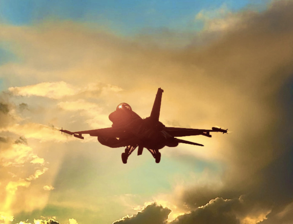 A U.S. Air Force F-16 at late sunset as storm clouds dissipate.