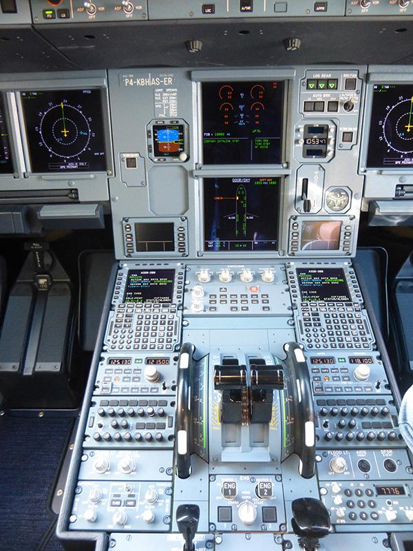 An Air Astana flight attendant inspects the latest addition to the fleet from the media center.