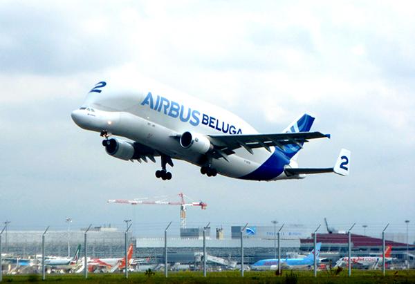 An Airbus Beluga transporter takes off from Blagnac.