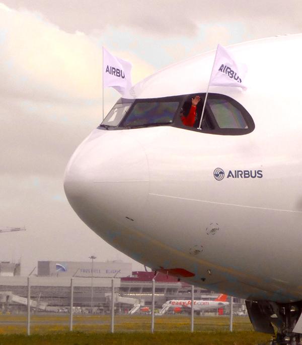 The A330neo on the tarmac in front of the aircraft delivery center in Toulouse.