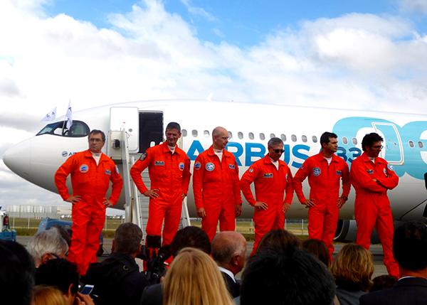 Airbus employees welcome the aircraft and its crew.