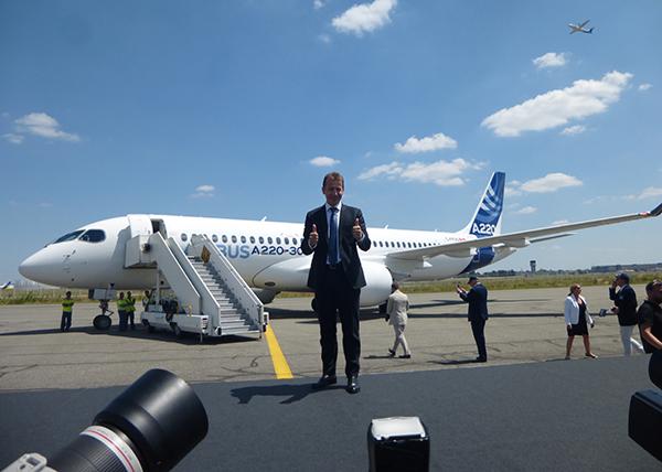 Airbus Commercial Aircraft president Guillaume Faury in front of the A220. There are 402 firm orders for the A220. A total of 38 aircraft have been delivered to three airlines—airBaltic (9), SWISS (23) and Korean Air (6).