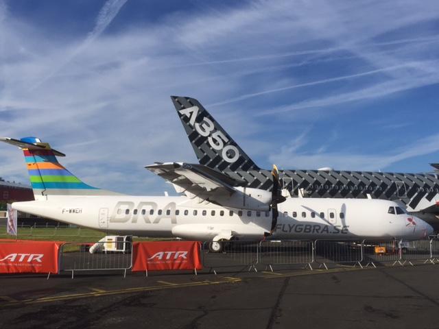 A tale of two tails: This colorful ATR 72-600 belonging to Scandinavian carrier Braathens was parked next to the monochrome A350-900.