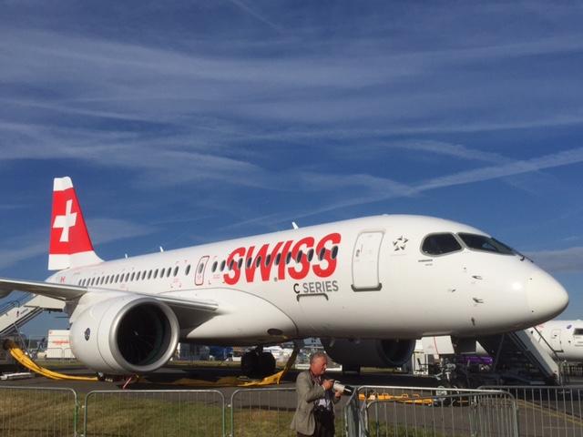 The first Swiss Bombardier CSeries, together with a visitor who proved that, in Britain, you're never too old to be a planespotter.
