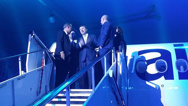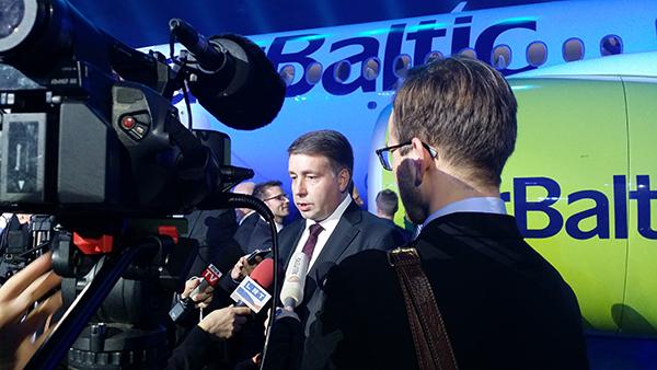 AirBaltic CEO Martin Gauss (center) speaks ahead of the unveil.
