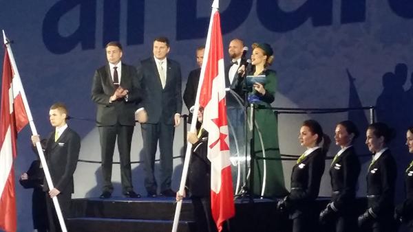 Latvia's transport minister Anrijs Matīss (left) and president Raimonds Vējonis (center) welcome the new aircraft.