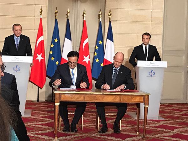 Turkish Airlines has signed an MOU with Airbus to acquire 20 A350-900s, plus five options. The agreement was signed at the Élysée Palace, Paris, during Turkish President Recep Tayyip Erdoğan’s official visit to France with French President Emmanuel Macron. Seated, from left: Turkish Airlines board chairman İlker Aycı and Airbus CEO Tom Enders.