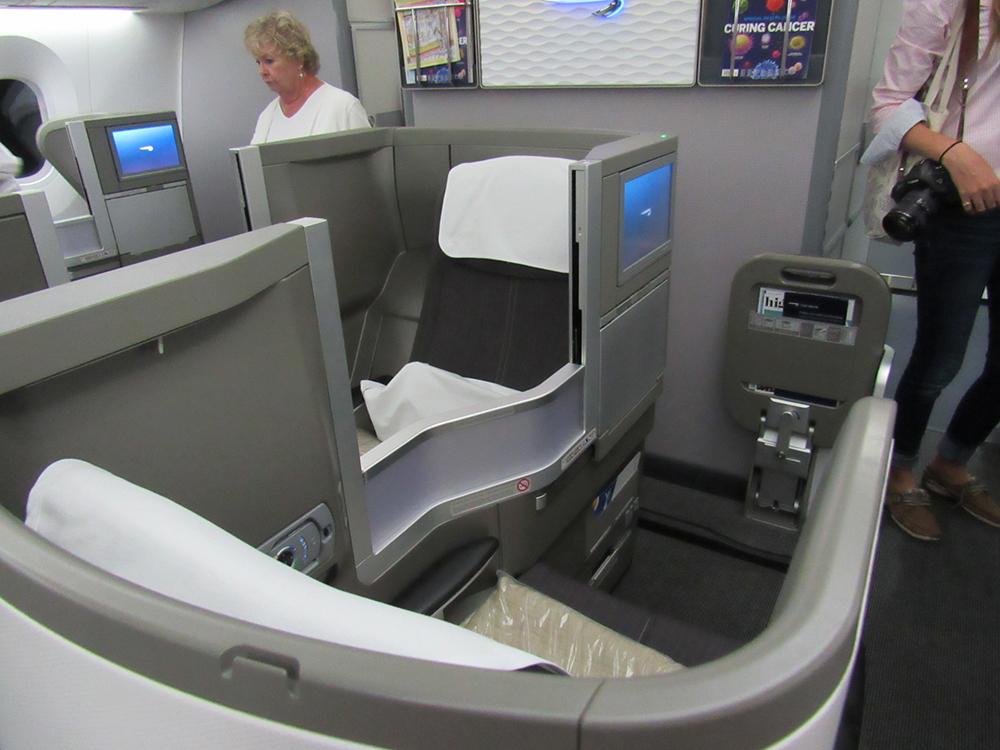 Club World (business class): Rear-facing middle seat offers additional interior storage space, e.g. for a laptop/iPad and extra flat surface for drinks and magazines. It also provides enhanced privacy for working and sleeping with aisle access in either direction.