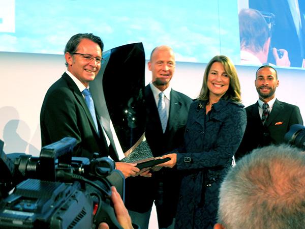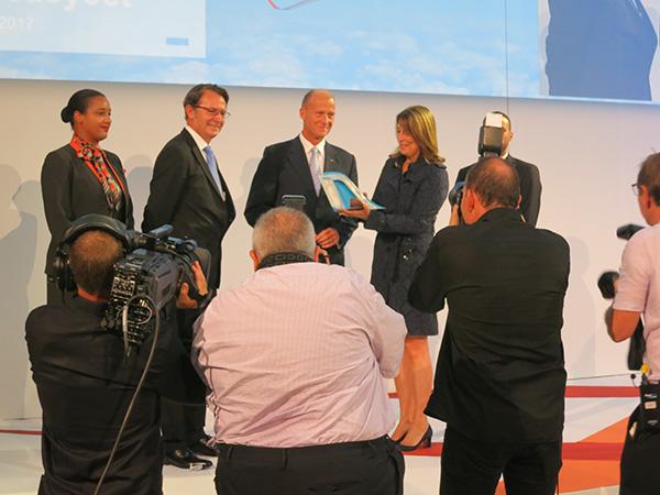 EasyJet CEO Carolyn McCall presents the CEOs of Airbus Group and CFM with pictures to mark the airline's 300th Airbus delivery.