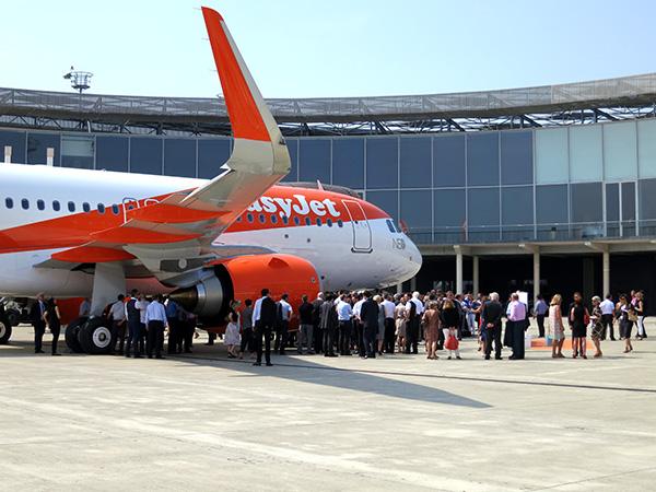 Media, Airbus and easyJet executives welcome the airline's new A320neo.