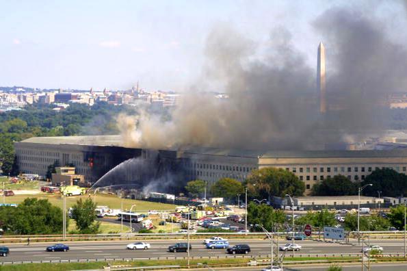 The Washington Monument stands in the background as the Pentagon burns after a hijacked American Airlines Boeing 757-200, Flight 77, was crashed into the iconic US military headquarters just south of the US capital.