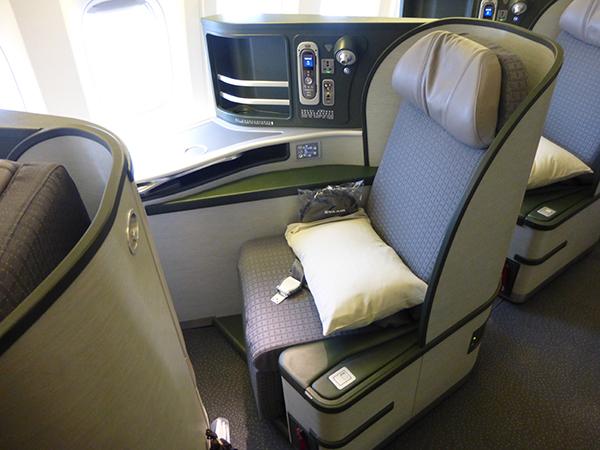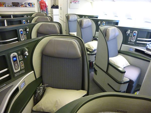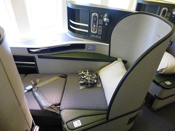 Business class seats transform into a full flat bed.